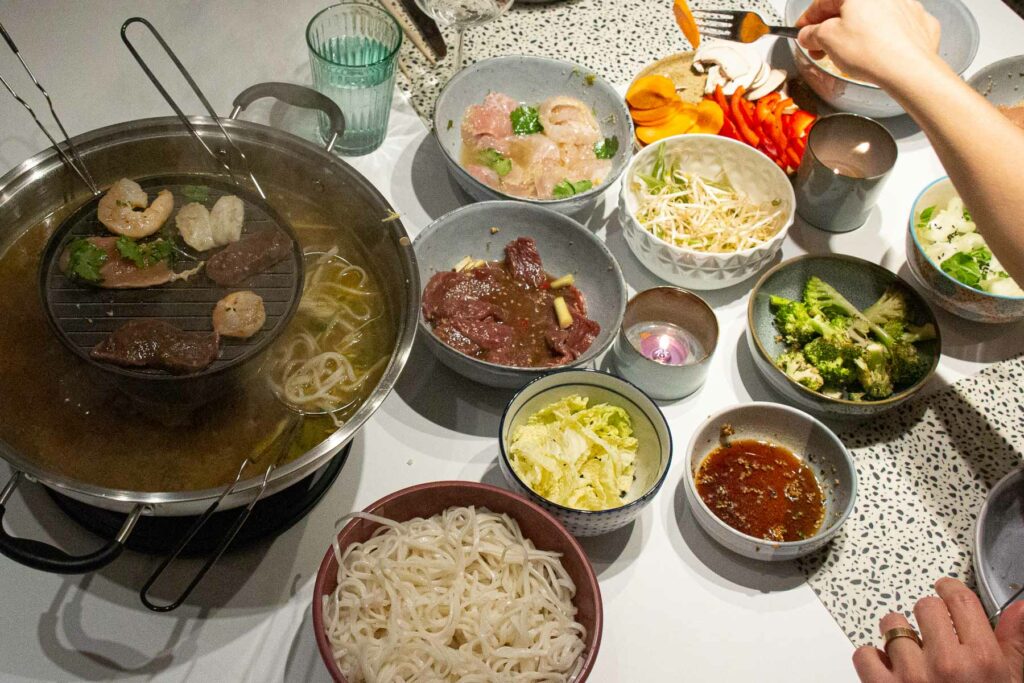 Je kunt speciale hotpot bouillon kopen bij de toko.